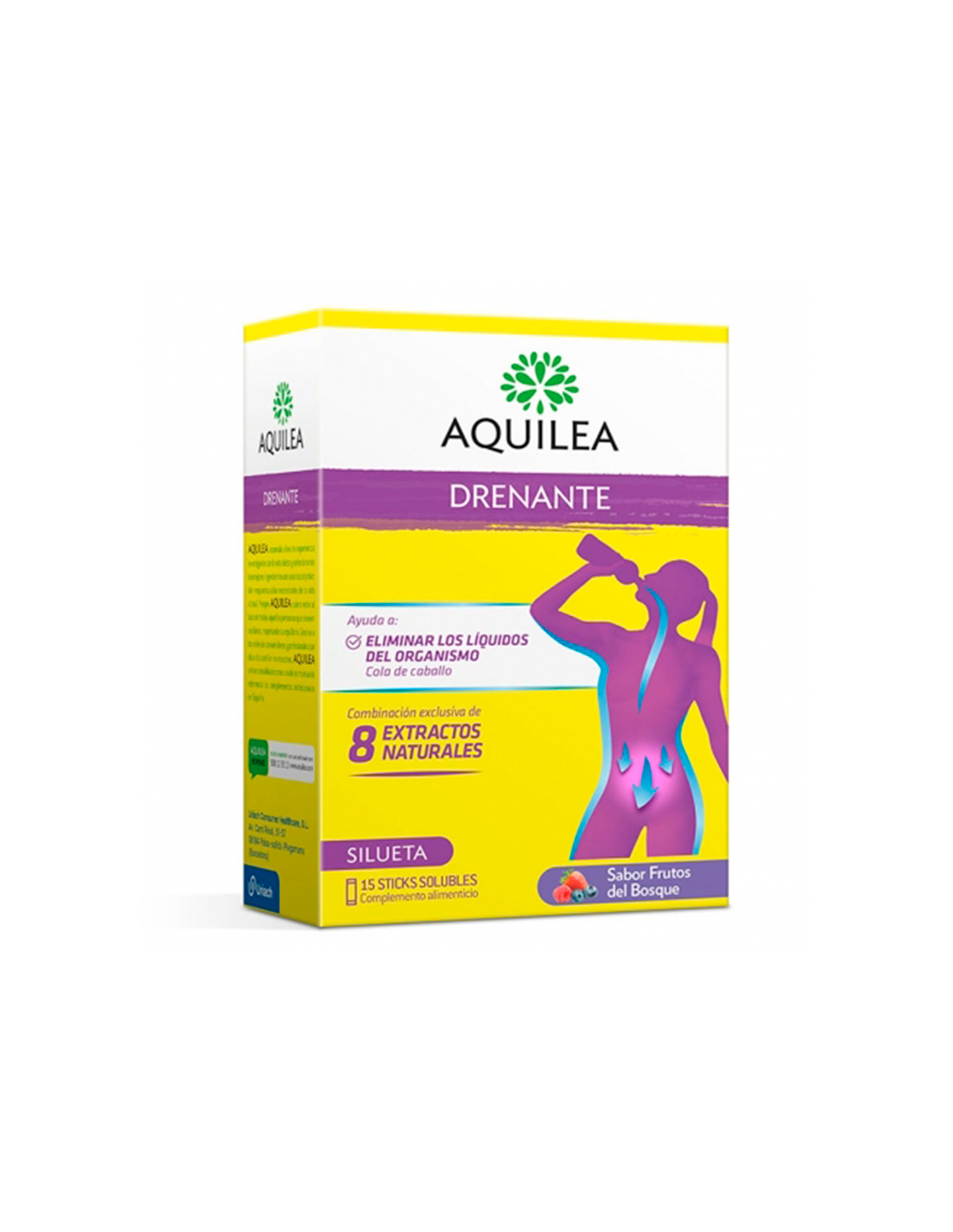 Complemento alimenticio drenante a base de cola de caballo, rabos de cereza, ortosifon, ulmaria, abedul, grama, ortiga e hibisco.