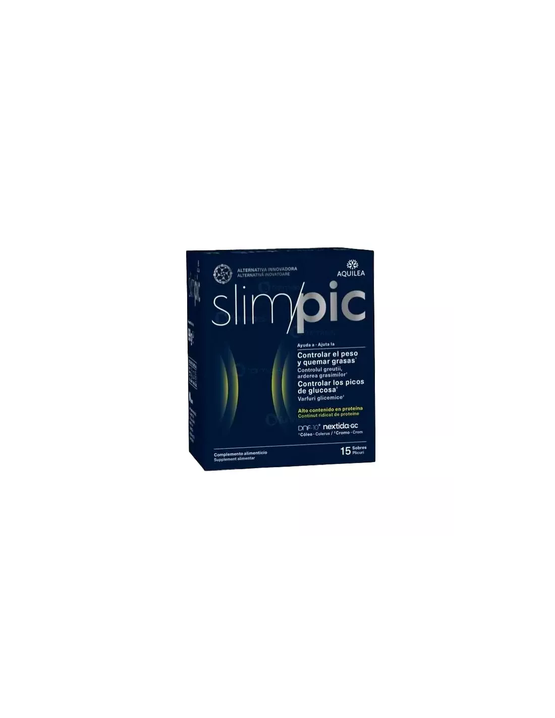 Aquilea Slimpic es un complemento alimenticio en formato de sobres solubles con sabor a limón, diseñado para apoyar el control del peso corporal.